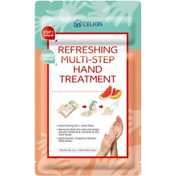 Een verfrissende verzorgende behandeling in twee stappen voor droge en beschadigde handen. Een zachte peeling en een hydraterend masker geparfumeerd met zoete grapefruit zorgen voor de gevoede en geregenereerde uitstraling van uw handen. Peeling met fruitextracten helpt om de huid glad te maken en te reinigen en dode opperhuid te verwijderen, waardoor de handen worden voorbereid op de tweede fase van de behandeling. Een handmasker in de vorm van handschoenen gedrenkt in essentie met grapefruitextract, sheaboter, ureum en macadamia-notenolie hydrateert en verstevigt de huid intens. Na de behandeling krijgt de huid haar elasticiteit en mooie, stralende kleur terug. Handen zijn zacht, soepel en verfrist.